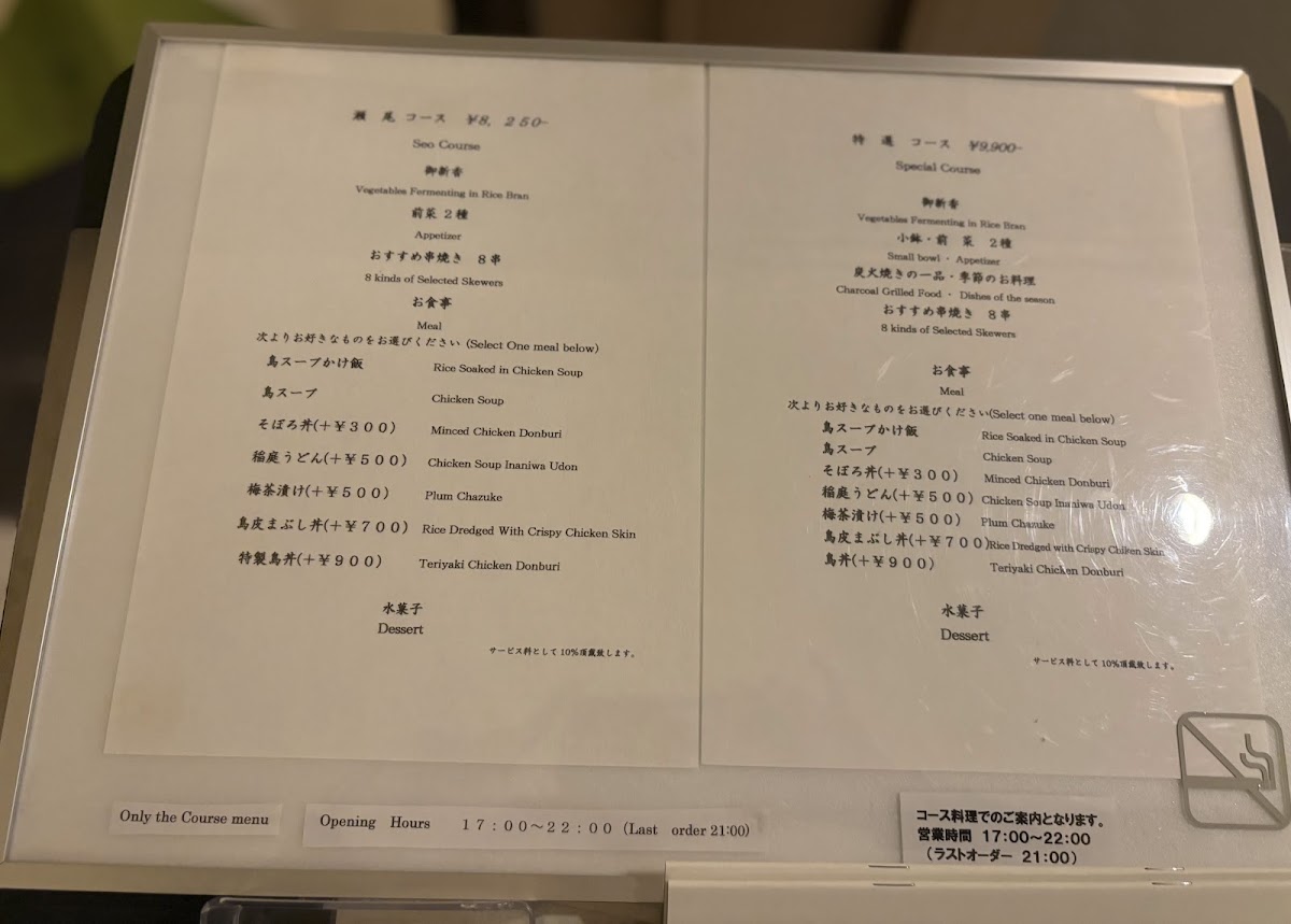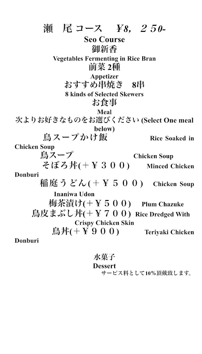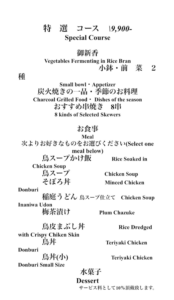 ・御新香(Vegetables Fermenting in Rice Bran) ・前菜(Appetizer of 2 Kinds) (鴨ロース・季節のお浸し) ・おすすめ串焼き 8串(Selected Skewers of 8 Kinds) ・お食事(Meal) ※お好きなものをお選びください(Select one meal below) スープかけ飯 そぼろ丼 稲庭うどん ・水菓子(Dessert)