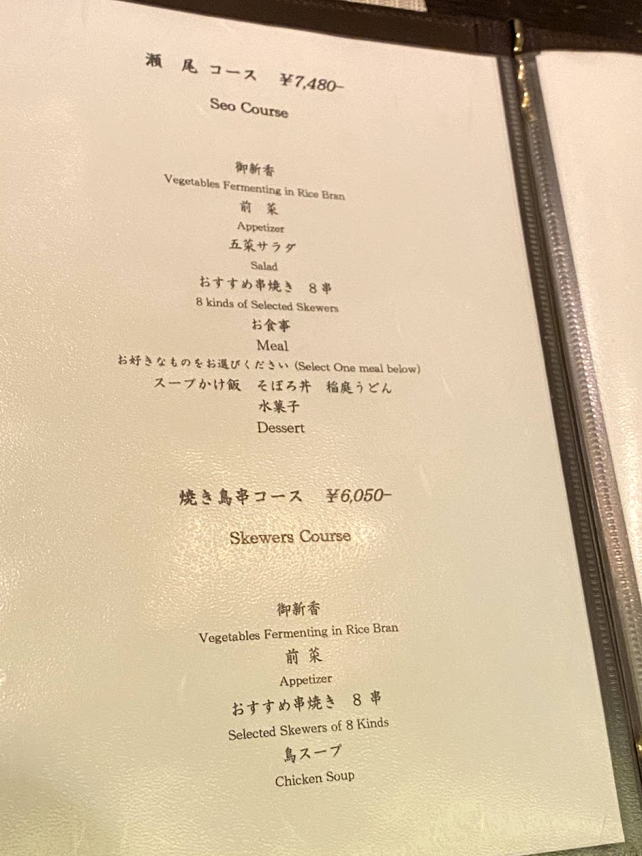 Yakitori Seo offers a thoughtfully curated menu that highlights the art of yakitori with a selection of premium courses. The Seo Course (瀬尾コース) presents a six-course meal designed to offer a balance of flavors and textures. For those looking for an even more refined experience, the Special Course (特選コース) delivers an elevated culinary journey. Pairing perfectly with the yakitori is a refreshing Draft Beer (生ビール), available to complement the grilled delicacies. Each dish is meticulously prepared, ensuring that every bite reflects the essence of traditional yakitori, making it a memorable dining experience.